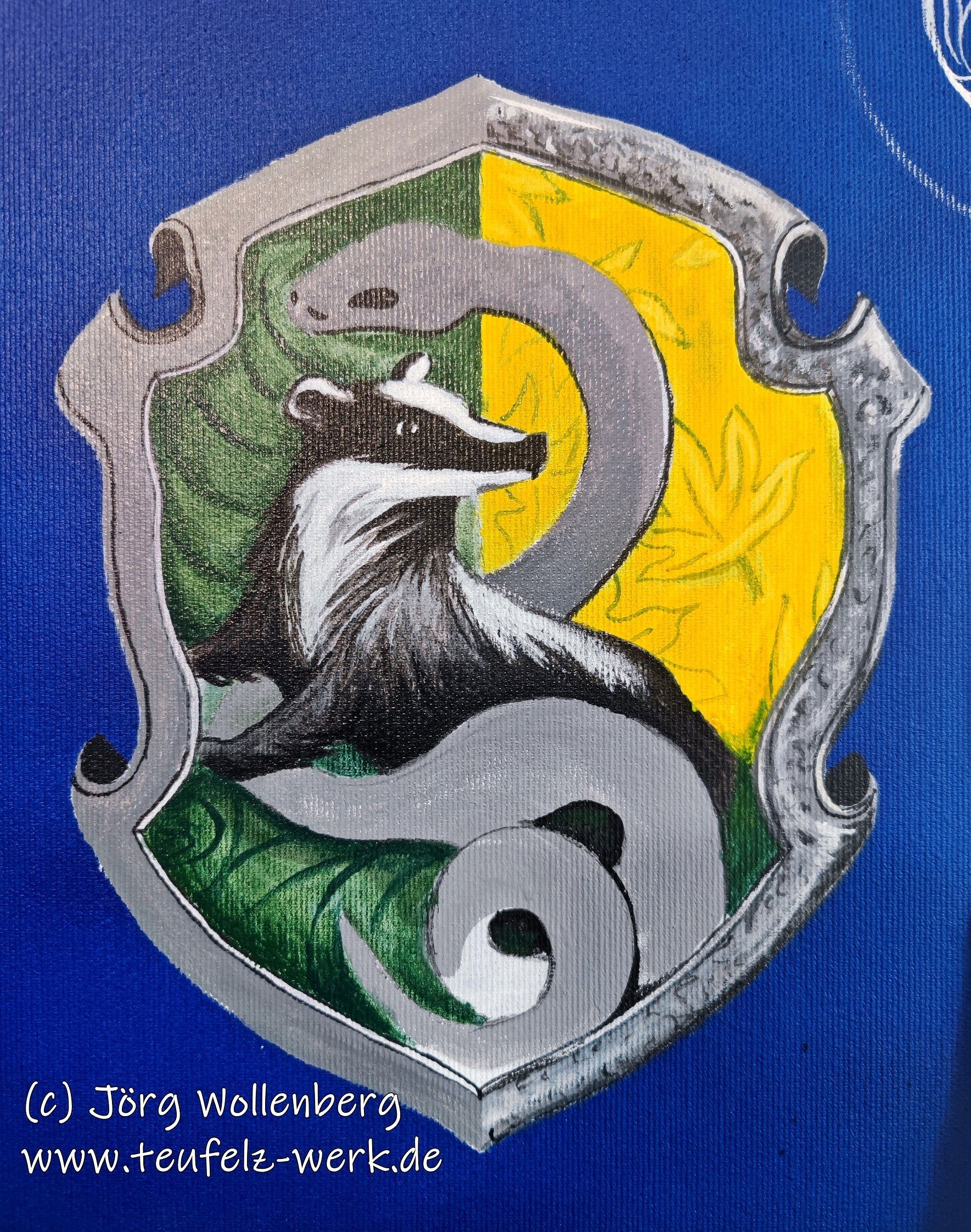 Ich kenne mich zwar mit dem Thema Harry Potter nicht besonders gut aus, doch die Umsetzung mit Airbrushpistole und Pinsel auf der Leinwand (ca. 70 x 90 cm) lief einfach nur. Diese Phantasie mit den Patronis Delfin und Occamy als auch mit dem zusammengesetzten Wappen fand schnell seinen eigenen Weg.