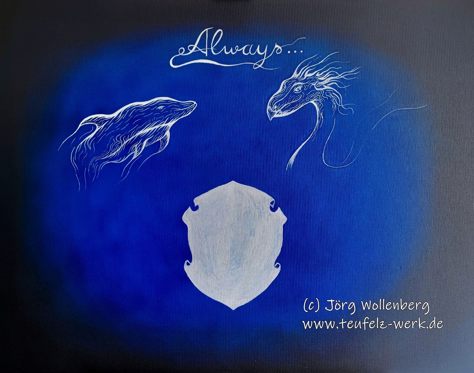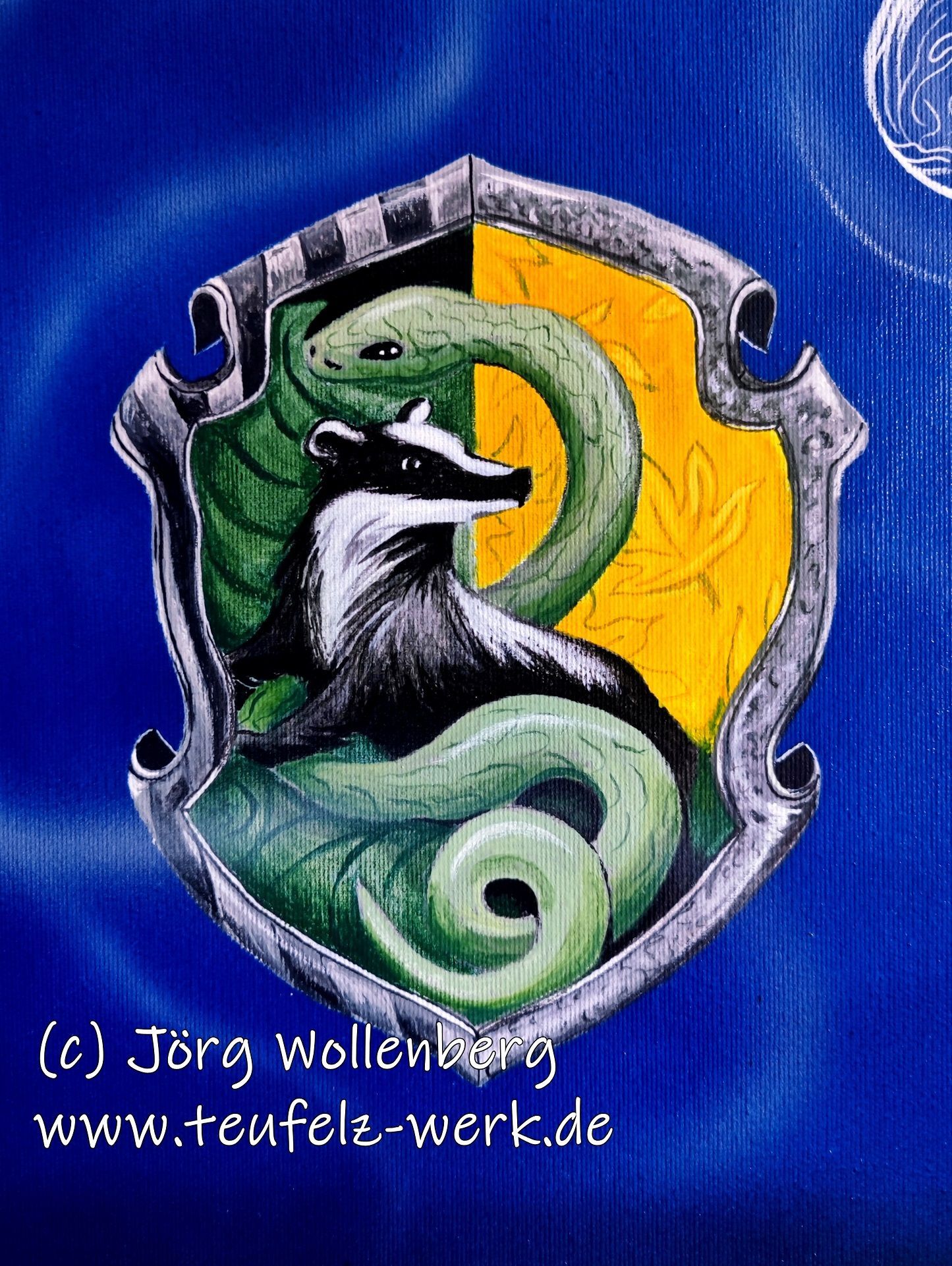 Ich kenne mich zwar mit dem Thema Harry Potter nicht besonders gut aus, doch die Umsetzung mit Airbrushpistole und Pinsel auf der Leinwand (ca. 70 x 90 cm) lief einfach nur. Diese Phantasie mit den Patronis Delfin und Occamy als auch mit dem zusammengesetzten Wappen fand schnell seinen eigenen Weg.